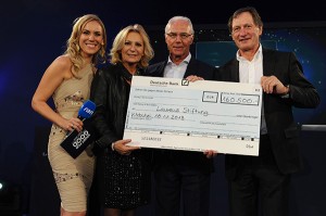 Kathi Wörndl, Sabine Christiansen, Franz Beckenbauer, Franz Klammer – Scheckübergabe